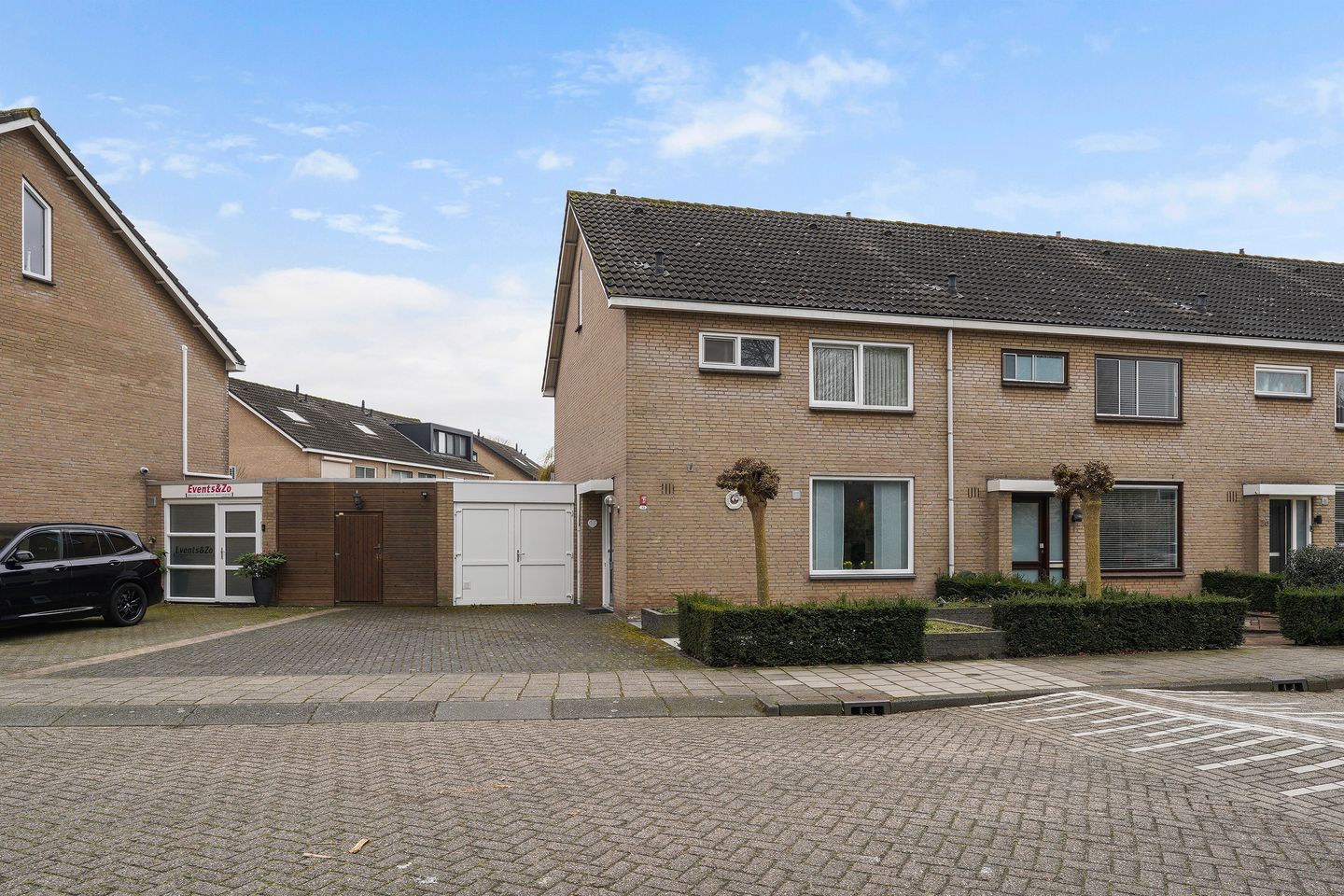 De woning beschikt over een garage met openslaande kunststof deuren. Wat deze woning extra bijzonder maakt, is de brede oprit aan de voorzijde. De voortuin waaiert namelijk uit, waardoor er opvallend veel parkeerruimte op eigen terrein aanwezig is.