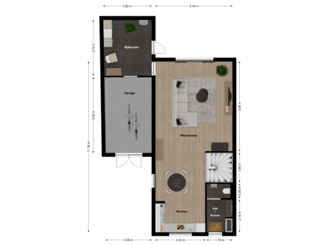 De begane grond van deze woning is bijzonder ruim en licht. De woonkamer is maar liefst een halve meter breder dan de andere woningen in de rij en er is bovendien ruim 2 meter uitgebouwd. Dit zorgt voor een hele fijne leefruimte. De afwerking is strak en modern. De vloerverwarming op de begane grond zorgt voor een aangename binnentemperatuur. De woning is verder voorzien van een praktische trapkast. Verder is de trap zo ontworpen dat deze mooi achter schuifdeuren wegvalt, wat de ruimte nog verder optimaliseert. Vanuit de woonkamer is een praktische bijkeuken te bereiken.