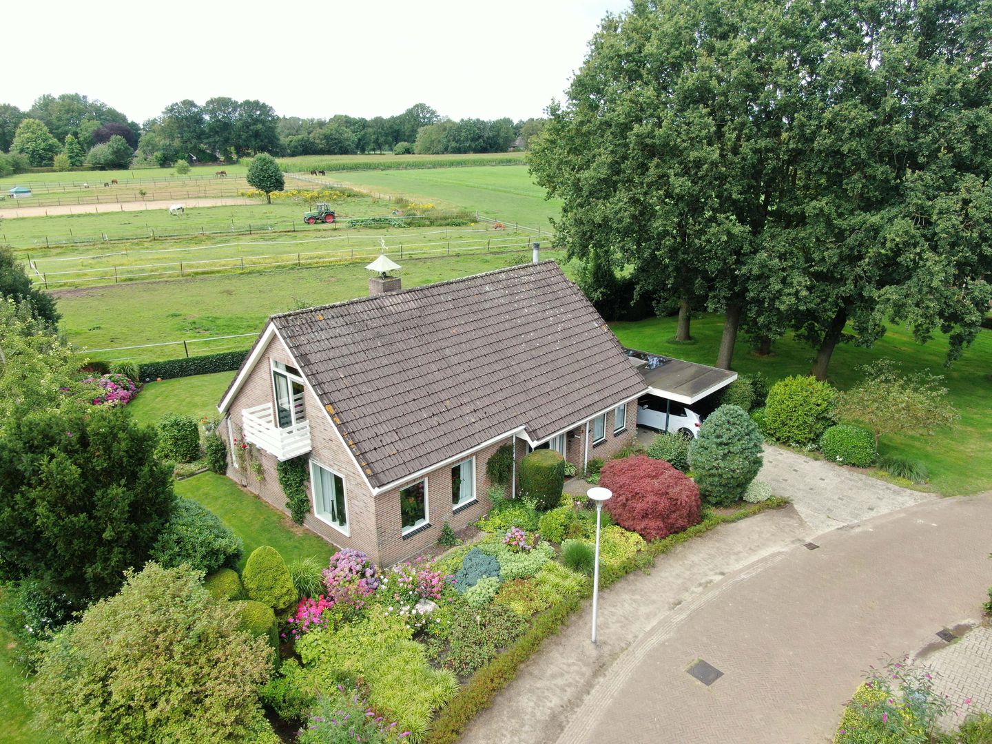 De tuin rondom de woning is fraai aangelegd, voorzien van terras met zonnescherm en grenst aan landerijen.