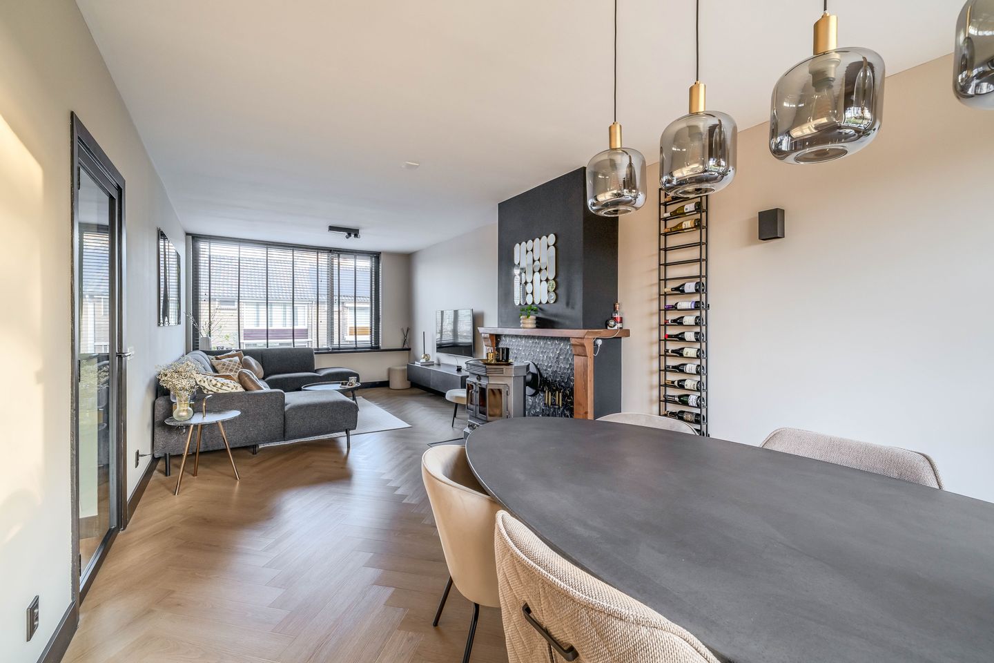De woonkamer van circa 9 meter diep is licht en sfeervol, voorzien van een glazen deur met zwarte omlijsting en een gezellige houtkachel. De afwerking is hoogwaardig en de wand- en plafondverlichting blijft achter. Ook de zwevende tv-kast blijft aanwezig.