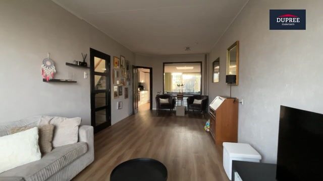 Via de entree komt u binnen in de hal met trapopgang en toegang tot de woonkamer. De woonkamer is heerlijk diep en heeft een warme houtlook laminaatvloer die doorloopt tot in de keuken. De wanden zijn afgewerkt in rustige beige- en grijstinten. Grote ramen aan de voorzijde met houten jaloezieën en zandkleurige gordijnen zorgen voor veel licht en een prettige sfeer.