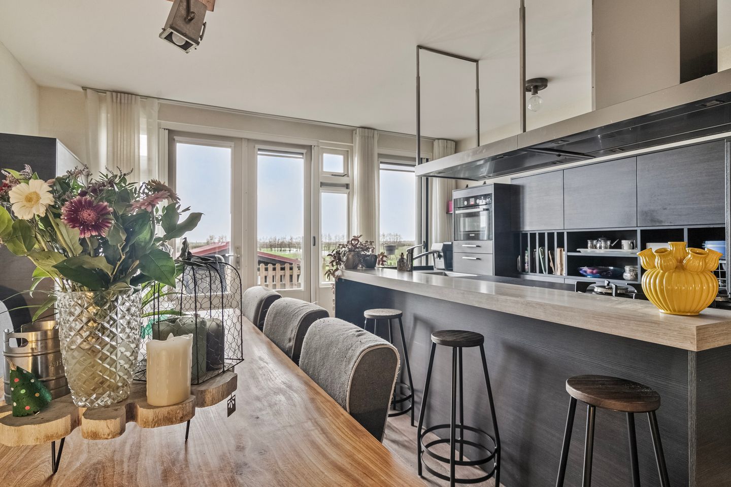 Bij binnenkomst in de hal is daar de (vernieuwde) meterkast, het geheel betegelde toilet met fontein, trap naar de verdieping en de trapkast. Vervolgens komt u binnen in de sfeervolle woonkamer en keuken met eetgedeelte. Het moderne kookeiland met geïntegreerd bargedeelte biedt niet alleen extra werk- en opbergruimte, maar vormt ook een uitnodigende plek om samen te komen. Terwijl u kookt, kunnen uw gasten of familie comfortabel plaatsnemen aan de bar om gezellig bij te praten of te genieten van een hapje en een drankje. De keuken is voorzien van de nodige inbouwapparatuur als: gasfornuis, afzuigkap, koelkast, vaatwasser en combimagnetron.