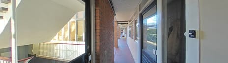 Via de centrale entree loop je naar binnen, en loop je vervolgens rechtsaf naar huisnummer 154. Bij deze galerij komen geen andere bewoners, waardoor je heel rustig woont. Achter de voordeur is de ruime hal, met de meterkast en de trap naar de eerste verdieping. Aan de andere zijde van de hal is de toiletruimte, met een fonteintje en geheel betegelde wanden.