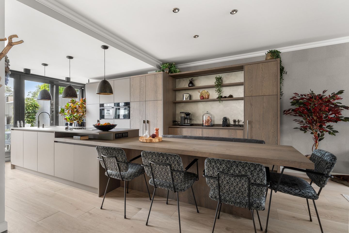 Een ruime hal met meterkast, trap en toilet met fontein verwelkomt je. De riante leefruimte heeft een moderne vloer met vloerverwarming. Aan de voorkant ligt de woonkamer met grote raampartijen, terwijl aan de achterkant de luxe eetkeuken zich bevindt. Deze moderne luxe open eetkeuken is uitgerust met een groot kookeiland, omgeven door kastruimte, en beschikt over luxe keukenapparatuur, zoals een inductiekookplaat met geïntegreerde afzuiging, een stoomoven, een 3-in-1 magnetron, een Quooker en een vaatwasser. De keuken is stijlvol afgewerkt en biedt toegang tot de tuin met een overkapping via een schuifpui. De luxe keuken vormt het stralende middelpunt van dit prachtige huis!