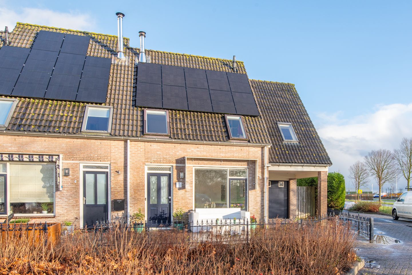 19 zonnepanelen: 10 panelen op het westelijke dakvlak, 4 panelen op het oostelijke dakvlak, alle geplaatst eind 2022. En er liggen ook nog 5 zonnepanelen op de tuinschuur, geplaatst in 2020. De zonnepanelen zijn voorbereid op een hybride CV-ketel en een thuisaccu. De omvormer van de zonnepanelen hangt op de 2e verdieping van de woning.