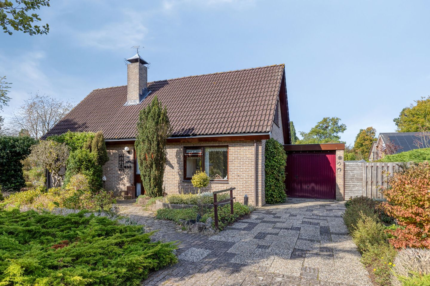 De woning biedt een riante tuin rondom met fraai aangelegde borders, sierbestrating, zitjes en een oprit voor de garage met parkeerruimte voor twee personenauto's op eigen terrein.