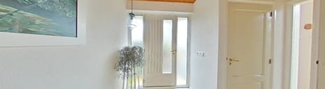 Aan de voorzijde is de overdekte entree van dit zeer ruime woonhuis. In de hal ligt een fraaie natuurstenen vloer die doorloopt in het toilet, de entree van de praktijkruimte, de badkamer en de woonkamer.