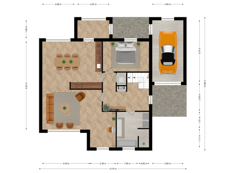 In deze ruime twee-onder-één-kapwoning in een rustige, groene straat in Waspik komen comfort en praktische ruimte mooi samen. Je stapt binnen in een lichte hal en loopt over de donkere tegelvloer richting de woonkamer. Door de grote ramen valt het daglicht royaal naar binnen, wat de ruimte een prettige sfeer geeft. De L-vormige woonkamer biedt genoeg plek om gezellig samen te zijn of juist rustig te ontspannen.