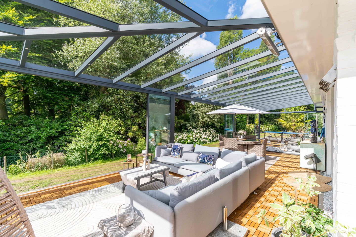 And here comes the real surprise: a full glass extension on two sides, seamlessly connecting indoors with outdoors. This creates an extra large and light-filled living space – perfect for sunny mornings or long summer evenings.