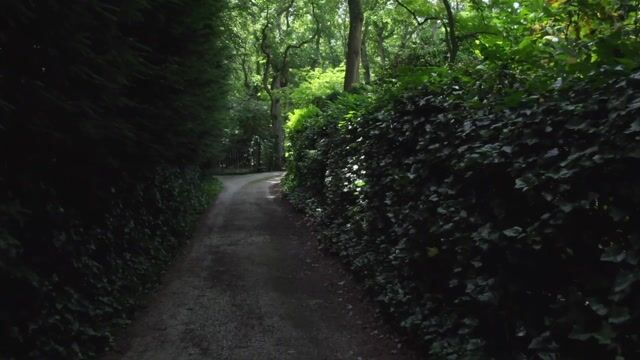 Het huis is bereikbaar via een lange oprit met een elektrisch toegangshek en ligt verscholen in het groen,