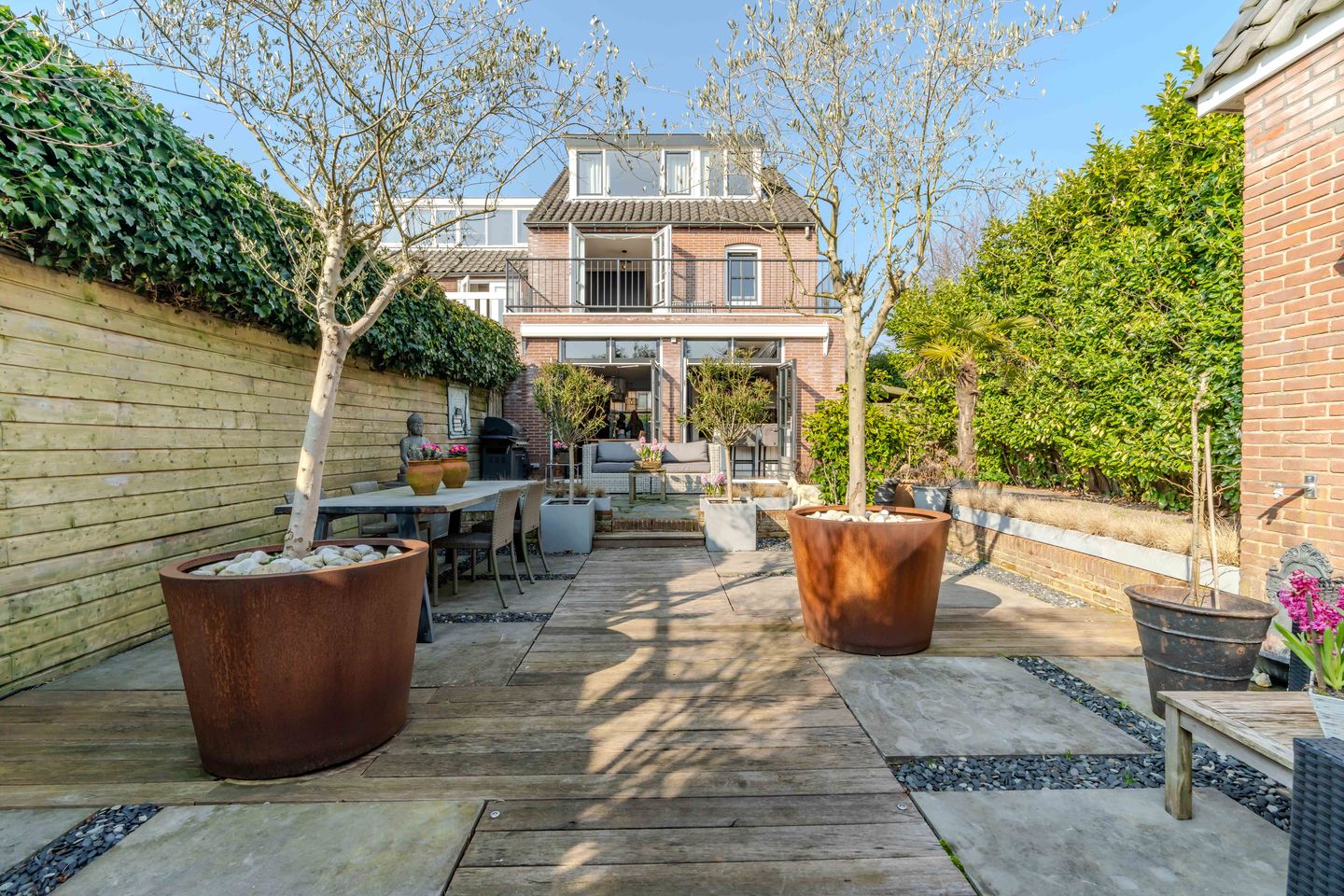 Ook buiten heeft deze woning veel te bieden. De voortuin beschikt over een eigen oprit met carport en garage, wat zorgt voor comfortabel parkeren op eigen terrein. De achtertuin is bijzonder diep en biedt meerdere sfeervolle zitplekken, zoals een loungehoek onder het zonnescherm, een plek voor een grote eettafel en gezellige veranda waar je het hele jaar door van het buitenleven kunt genieten.