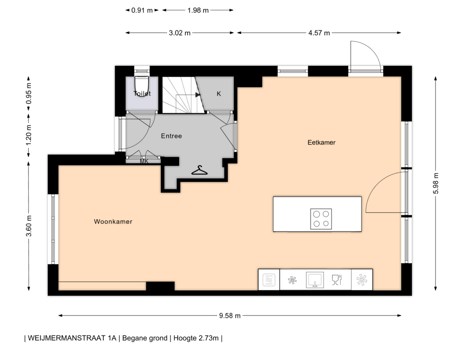 Aangelegde voortuin, entree, hal met garderobe, vernieuwde meterkast, trappenkast en toilet, uitgebouwde L-vormige woon-/eetkamer hoge raampartijen inclusief een zijraam en een woonkeuken met kookeiland voorzien van alle denkbare inbouwapparatuur, zoals een inductie kookplaat, oven, koel- vriescombinatie en vaatwasser. De begane grond is eveneens voorzien van een fraaie visgraat pvc vloer.