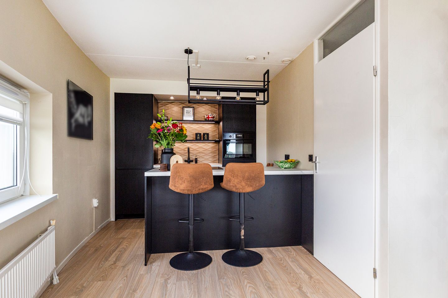De moderne open keuken is voorzien van diverse inbouwapparatuur, zoals een combi-oven, een inductiekookplaat met geïntegreerde afzuiging en een inbouwkoelkast. Aan de andere kant van het werkblad is er ruimte om te zitten – perfect om koken en gezelligheid te combineren.