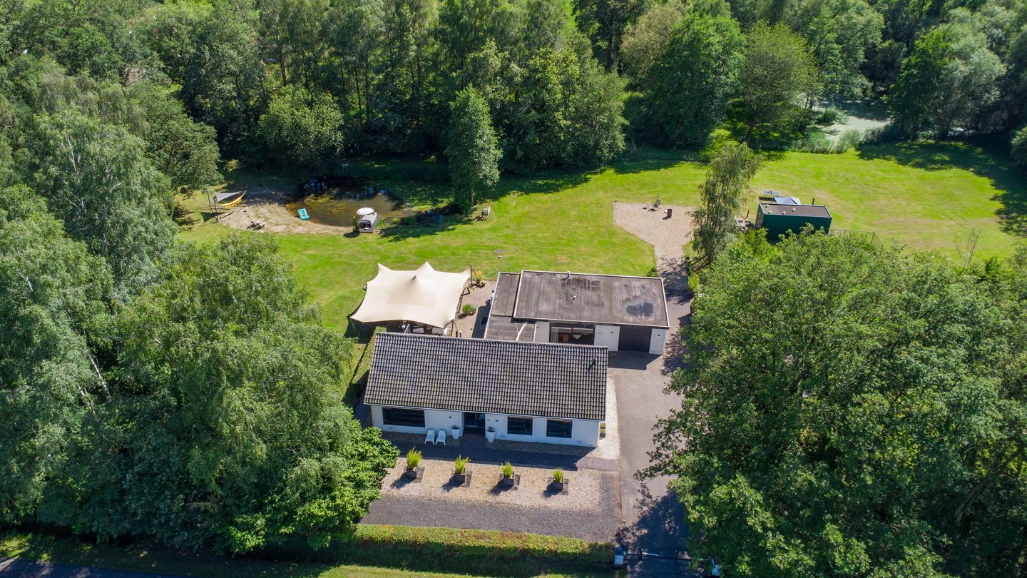 Het gehele perceel is omheind en de entree wordt gevormd door een elektrisch toegangshek. Rondom het huis is gekozen voor een tuin met strakke borders in stijl passend bij het huis, een gazon en twee grote vijvers waarvan 1 v.v. steigertje en klein 'strand'. Aan de achterzijde van het huis bevindt zich een groot houten terras waar men optimale privacy geniet. Verder is er een kleiner overdekt terras met tv-aansluiting. Dit terras biedt zicht op de televisie in de zitkamer en is uitermate geschikt voor het plaatsen van een Jacuzzi. Een gedeelte van het perceel bestaat uit grasland en heeft een agrarische bestemming.