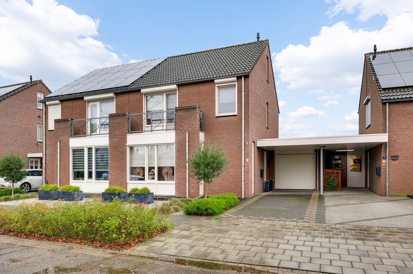 De garage is via de tuinkamer bereikbaar. Er is voldoende bergruimte, een keukenblok met wateraansluiting en een elektrische sectionaaldeur. Aan de voorzijde een praktische carport.