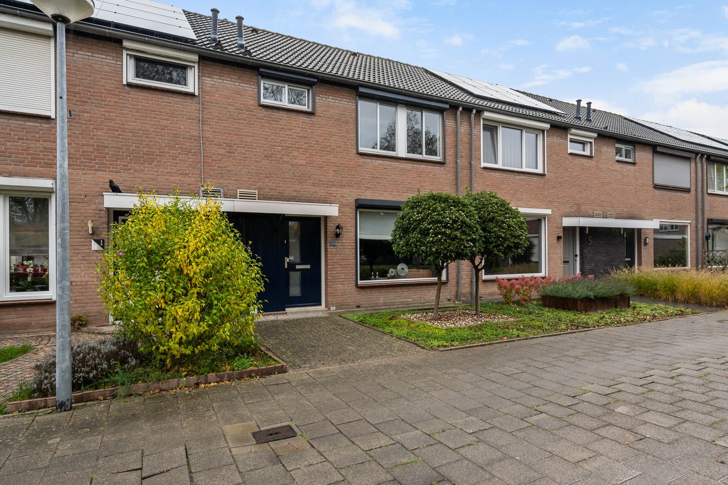 Vanuit het trottoir is er via een bestraat looppad door de voortuin toegang tot de overdekte entree aan de voorzijde van de woning.