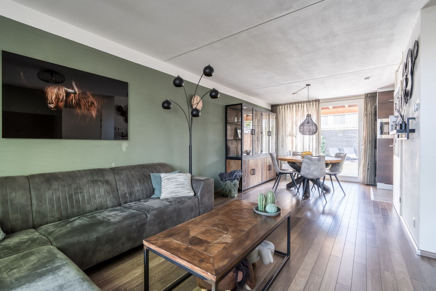 - Sfeervolle woonkamer met laminaatvloer, elektrisch rolluik en schuifpui