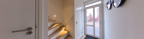 De hal verwelkomt je met een moderne toiletruimte, meterkast en stijlvolle trapopgang met verlichting.