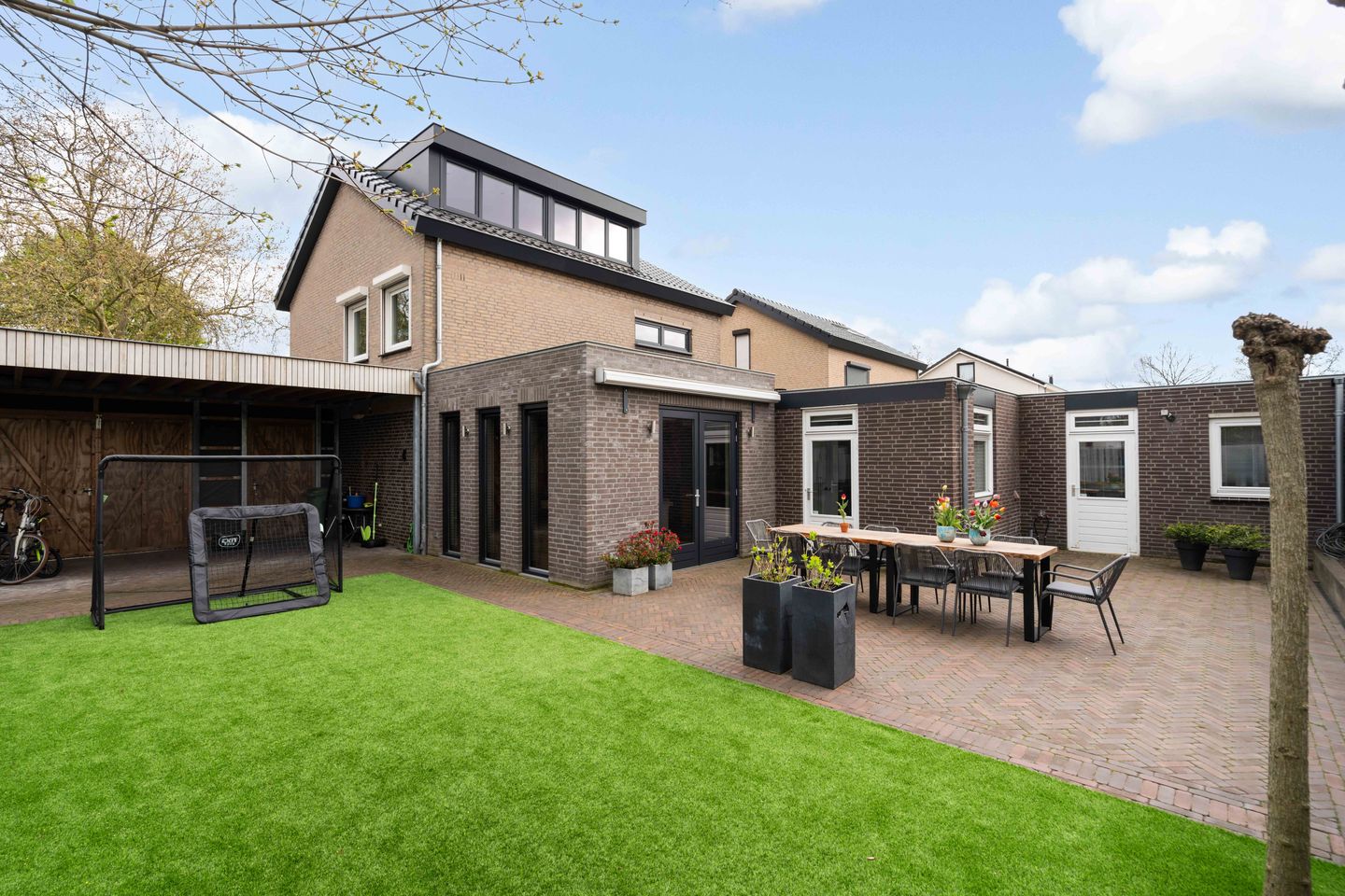 Aan de achterzijde bevindt zich een stijlvolle overkapping (2020), voorzien van een loopdeur en twee openslaande deuren. De tuin is tevens bereikbaar via een achterom met afsluitbare poort.