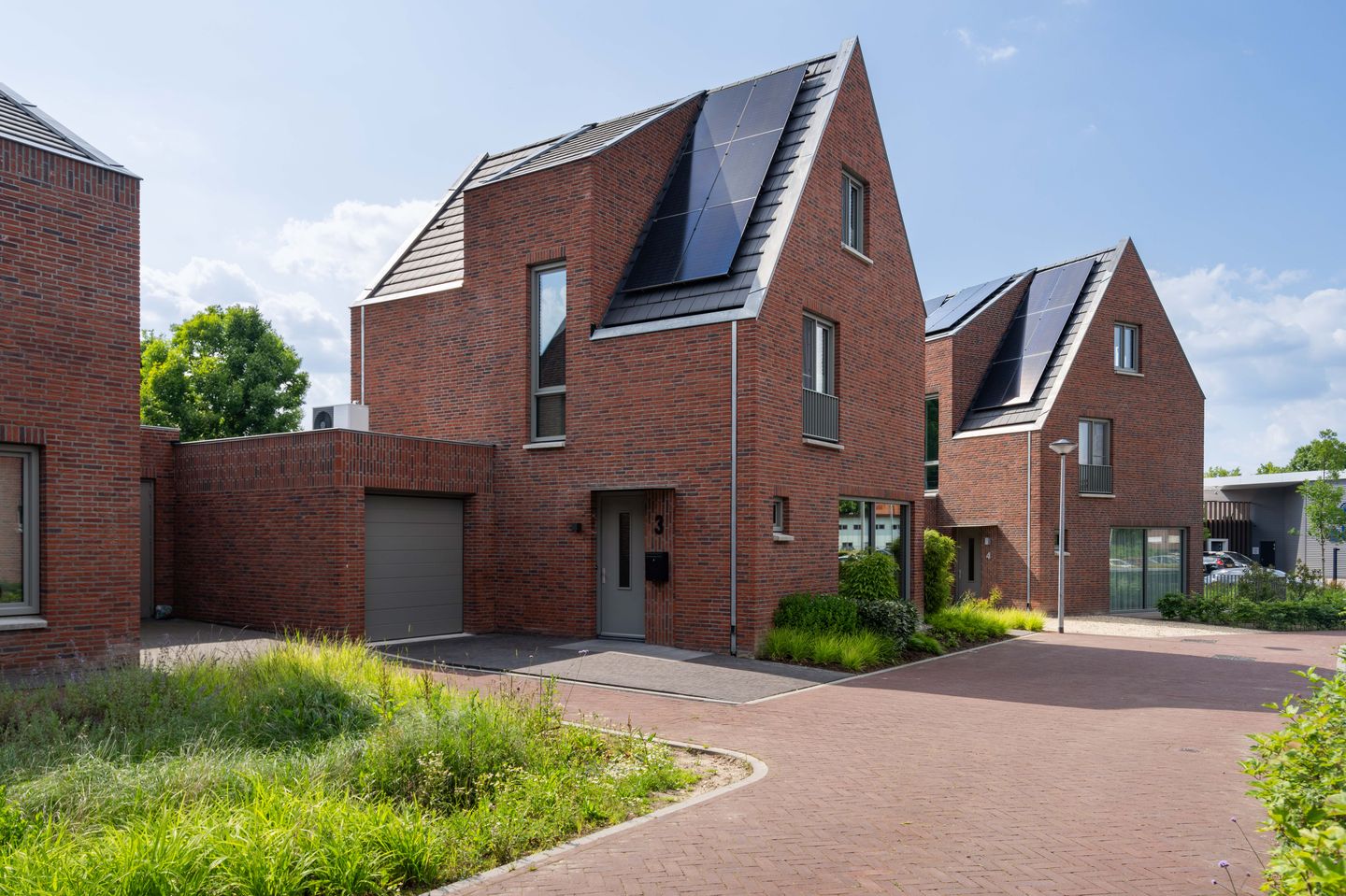 Vanuit het verkeersluwe woonerf is er via de oprit toegang tot de overdekte entree aan de voorzijde van de woning.