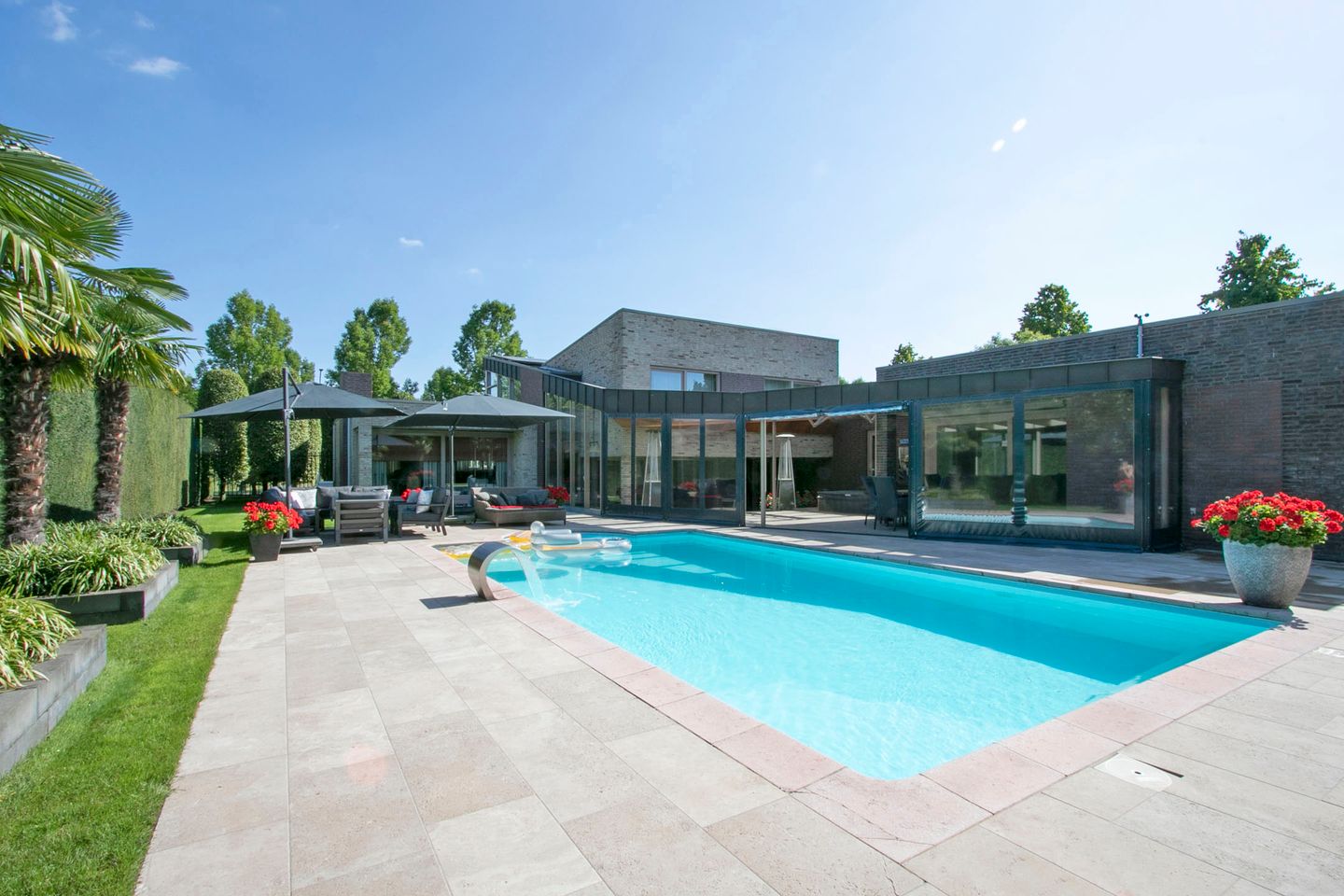 Een uitgestrekte gang verbindt de sfeervolle woning met het ruime en compleet ingerichte kantoorgedeelte. Niet alleen binnen, maar ook buiten is het genieten van alle luxe! Onder het grote overdekte terrasgedeelte met jacuzzi is het zomer en winter heerlijk toeven. En op warme dagen neem je zo een verfrissende duik in het grote zwembad dat omgeven wordt door een fraai aangelegde tuin.