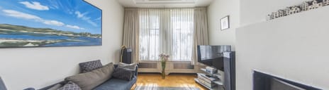 De woonkamer is voorzien van een visgraatvloer met bies. Aan de voorzijde bevindt zich een werkende open haard met gestuukte afwerking en onder de hoge ramen staan klassieke radiatorombouwen, geheel passend bij de stijl van het huis. De hoge plafonds zijn in perfecte staat, zorgvuldig gerestaureerd met behoud van sierlijsten en ornamenten.