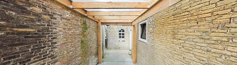 Tenslotte een ruime en sfeervolle slaapkamer met toegangsdeur naar een overdekte binnentuin. Boven slaapkamer en bijkeuken is een bergzolder (hoog ca. 70cm), bereikbaar via een vlizotrap.