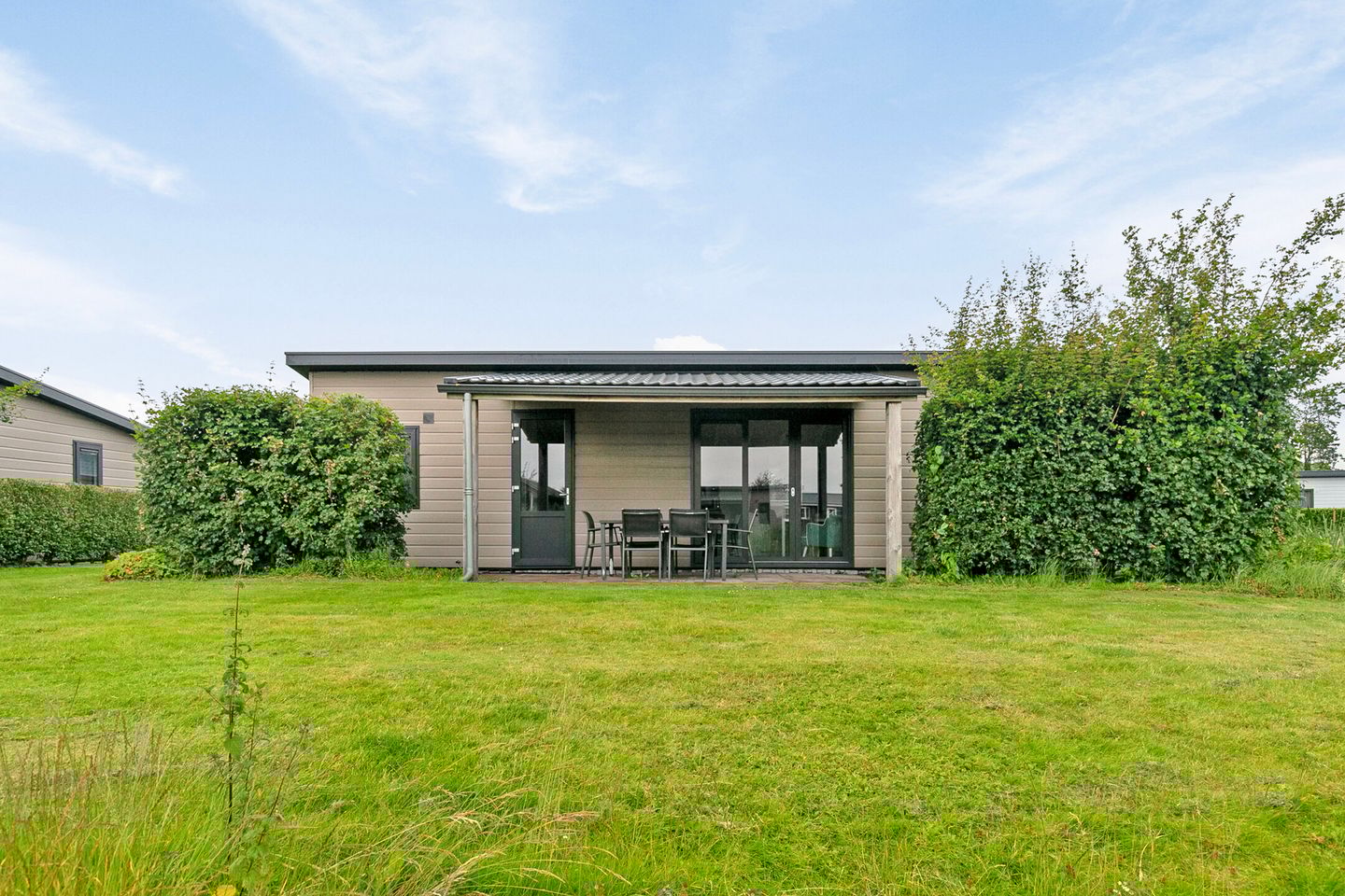 Upon entering, you will immediately notice the light and spacious layout of this chalet. The modern dark floor is very neatly finished and gives the entire chalet a luxurious look. After the open hall you immediately enter the open living and dining room with open kitchen. The French doors lead to the canopy in the garden. The doors, together with the large window on the other side, provide plenty of natural light. The kitchen has a four-burner hob, combination microwave, extractor hood, sink with mixer tap, large built-in fridge-freezer and dishwasher. The room has enough space for a spacious seating area and a dining area with space for at least 6 people. Behind the dining area are the access doors to two bedrooms.