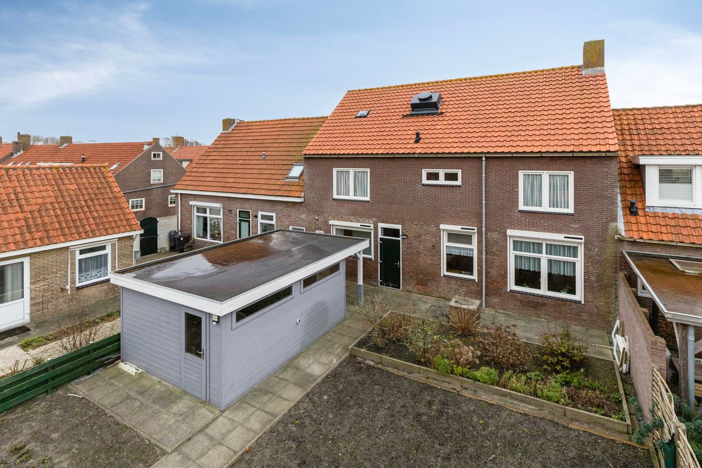 De riante achtertuin is gelegen op het noorden en nog naar wens aan te leggen. De vrijstaande houten berging met overkapping is voorzien van elektra.