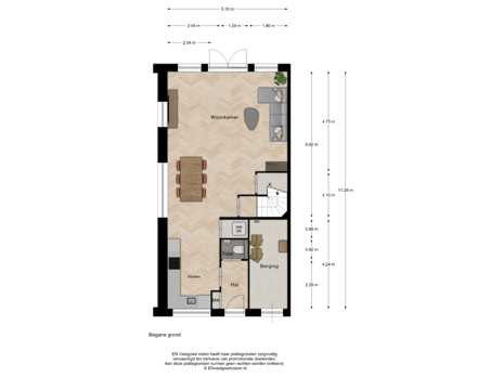 De woning is praktisch en functioneel ingedeeld, met naast de entree een handige inpandige (fietsen-)berging met technische ruimte. Op de begane grond gaan in de leefruimte de woonkamer en halfopen keuken in elkaar over. De keuken bevindt zich aan de voorzijde en wordt casco opgeleverd, zodat je deze helemaal naar eigen smaak kunt inrichten. In de keuken is een aparte wasruimte, nog meer bergruimte bevindt zich in de woonkamer, met extra berging onder de trap.