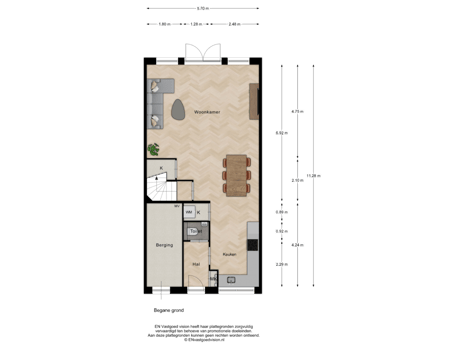Begane grond: entree met hal. Meterkast. Betegelde toiletruimte met wandcloset en fontein. L-vormige leefruimte met woonkamer aan de achterzijde en keuken aan de voorzijde. Deze wordt casco opgeleverd, met voorbereid leidingwerk. Gesloten wasruimte met aansluitingen wasmachine en -droger. De living heeft dubbele openslaande deuren naar de achtertuin op het zuiden.