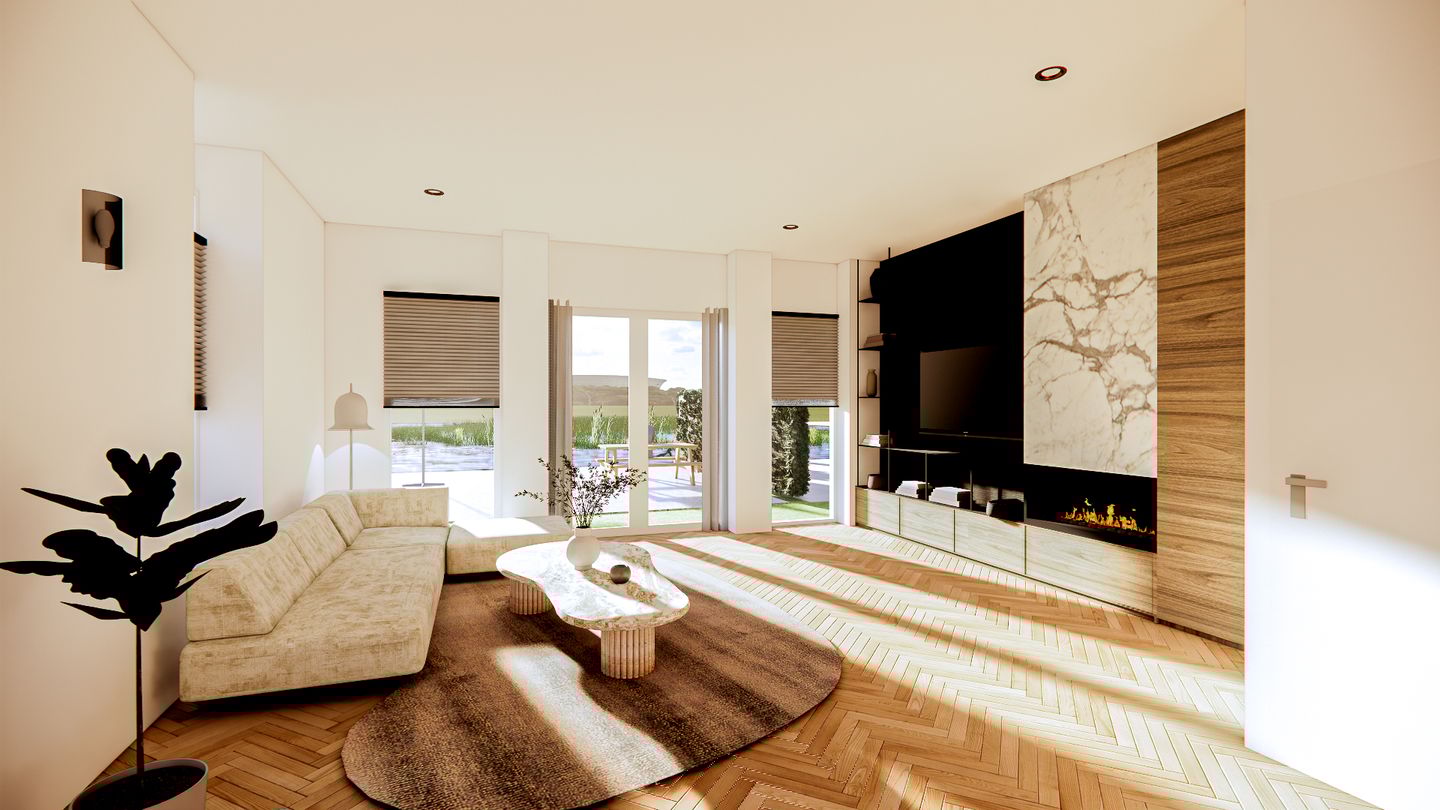 De woning is gebouwd met duurzame materialen. Zwarte houten delen, verticaal geplaatst, witte kozijnen en traditionele rode dakpannen zorgen voor de uitstraling die past bij de omgeving. Moderne installaties als vloerverwarming, mechanische ventilatie met warmteterugwinning en zonnepanelen maken de woning energiezuinig en toekomstbestendig.