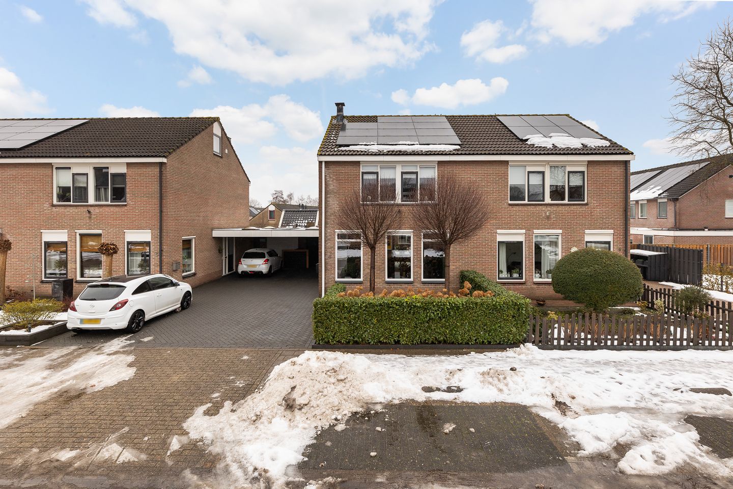 De achtertuin is in de tussentijd ook aangepakt. Het perceel is totaal 281 m2 groot en je hebt hier een diepe tuin met bijna altijd een plekje in de zon. Het is onder het witte jasje van sneeuw een beetje een verrassing, maar de tuin is strak en verzorgd aangelegd. Een terras aan de achterzijde, die je makkelijk via de schuifpui in de keuken bereikt, gazon en borders met beregeningssysteem en achterin de tuin nog een terras. Kiezen maar waar je wil zitten! De achtertuin is middels de schuttingdeur vanaf de oprit bereikbaar. Over de oprit gesproken. Deze ruime oprit is geschikt voor meerdere auto's en onder de carport kan er sowieso een auto droog staan. De garage is voorzien van water en elektra.