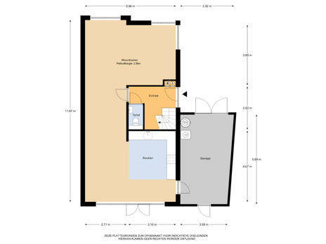 Begane grond: entree/ hal - toilet - trapopgang - L-vormige woonkamer - open keuken met schuifpui naar het terras - inpandig bereikbare aangebouwde garage.
