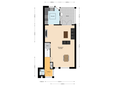 Entree met toegang tot toilet, trapopgang naar de eerste verdieping en woonkamer. Toilet met zwevend closet en fonteintje. De ruime woonkamer heeft een fraaie eikenhouten vloer en een airco. Aan de achterzijde via openslaande deuren bereikbare serre / tuinkamer (ca. 3 x 3 meter).