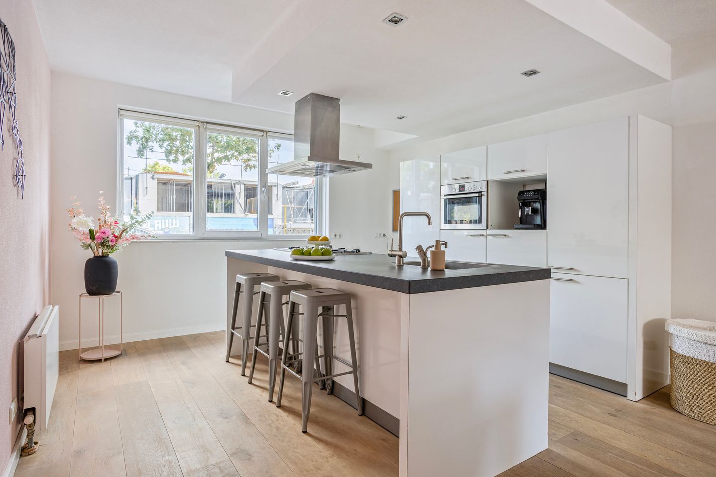 Je stapt binnen in een ruime hal met houten vloer, garderobe, meterkast, trapopgang, bergkast en een net toilet met fontein. Aan de voorzijde bevindt zich de tijdloze woonkeuken met kookeiland. De keuken is afgewerkt in hoogglans wit met een stijlvol antracietstenen blad en voorzien van alle gemakken: een Quooker, 5-pits gaskookplaat, afzuigkap en een vaste kastenwand met combimagnetron, koelkast en vriezer. De royale woonkamer is tuingericht en heeft twee keer dubbele openslaande deuren richting de tuin. Dankzij de houten vloer en strakke afwerking voelt dit direct als een warme leefruimte. Extra comfort wordt geboden door de airconditioning (2023, ook geschikt om te verwarmen).