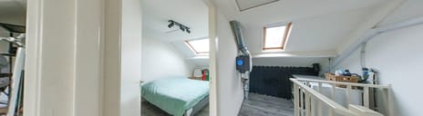 Via een vaste trap komt u op de overloop van de tweede verdieping. Deze ruimte heeft veel bergruimte onder de schuine kanten en hier is een aparte ruimte voor de CV-ketel gecreëerd. In de naastgelegen ruimte zijn de aansluitingen voor de wasmachine en droger. Er zijn op deze verdieping een kleinere kamer met dakraam en een grotere slaapkamer met dakkapel. Als extra bergruimte bevindt zich boven deze zolderruimtes nog een vliering.