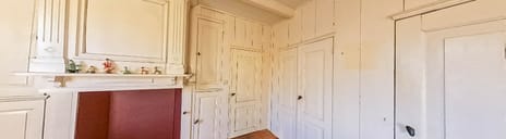Aansluitend de zitkamer met schouw en vaste kasten achter fraaie paneeldeuren. De woon- en zitkamer zijn beide voorzien van prachtige houten vloerdelen en sfeervol balkenplafond. Vanuit deze kamer, verborgen achter de paneeldeuren, bereikt u de badkamer. De badkamer is geheel betegeld in lichte kleurstelling en beschikt over een toilet, wastafel en douchehoek.