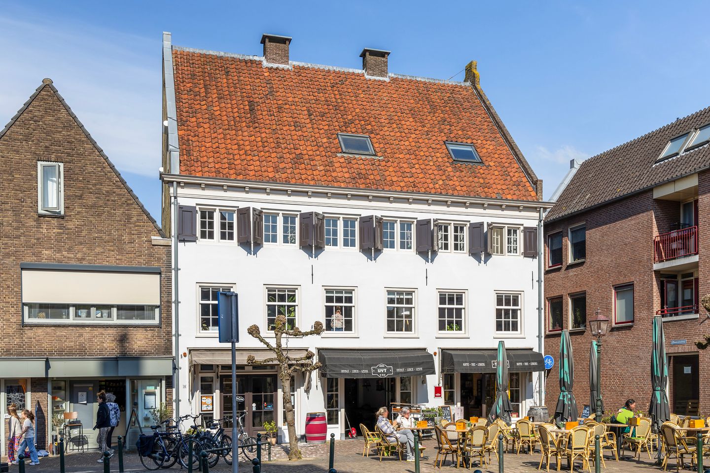 1e VERDIEPING: Via het dakterras bereikt u de voordeur van het appartement. U komt binnen in de open woonkeuken welke is uitgerust met een kookeiland voorzien van een 5-pits inductie kookplaat met geïntegreerd afzuigsysteem en een barretje, oven, magnetron, vaatwasser en koel-vriescombinatie. De woonkamer is aan de voorzijde gelegen en kijkt uit op de winkelstraat en de Grote Kerk. De ruimte is aangenaam licht en alleen de details zoals het originele balkenplafond verraden de rijke historie van dit appartement. Onder de trap vindt u een trapkast die de nodige praktische bergruimte biedt.