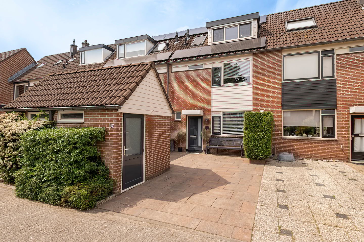 De voortuin is netjes bestraat en v.v. parkeergelegenheid op eigen terrein, ruimte voor de kliko's en hier bevindt zich ook een stenen berging v.v. vliering en elektra.