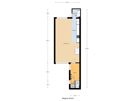 Parterre: hal/entree, toilet met fontein, bergruimte/garderobekast, zeer ruime en lichte woonkamer (ca. 34 m²) met fraaie houten vloer, strak gestuukte wanden en plafonds en schuifpui naar de tuin,woonkamer overlopend in open keuken (ca. 9½ m²) voorzien van diverse inbouwapparatuur, deur naar bijkeuken/klompenhok aan de tuinzijde;