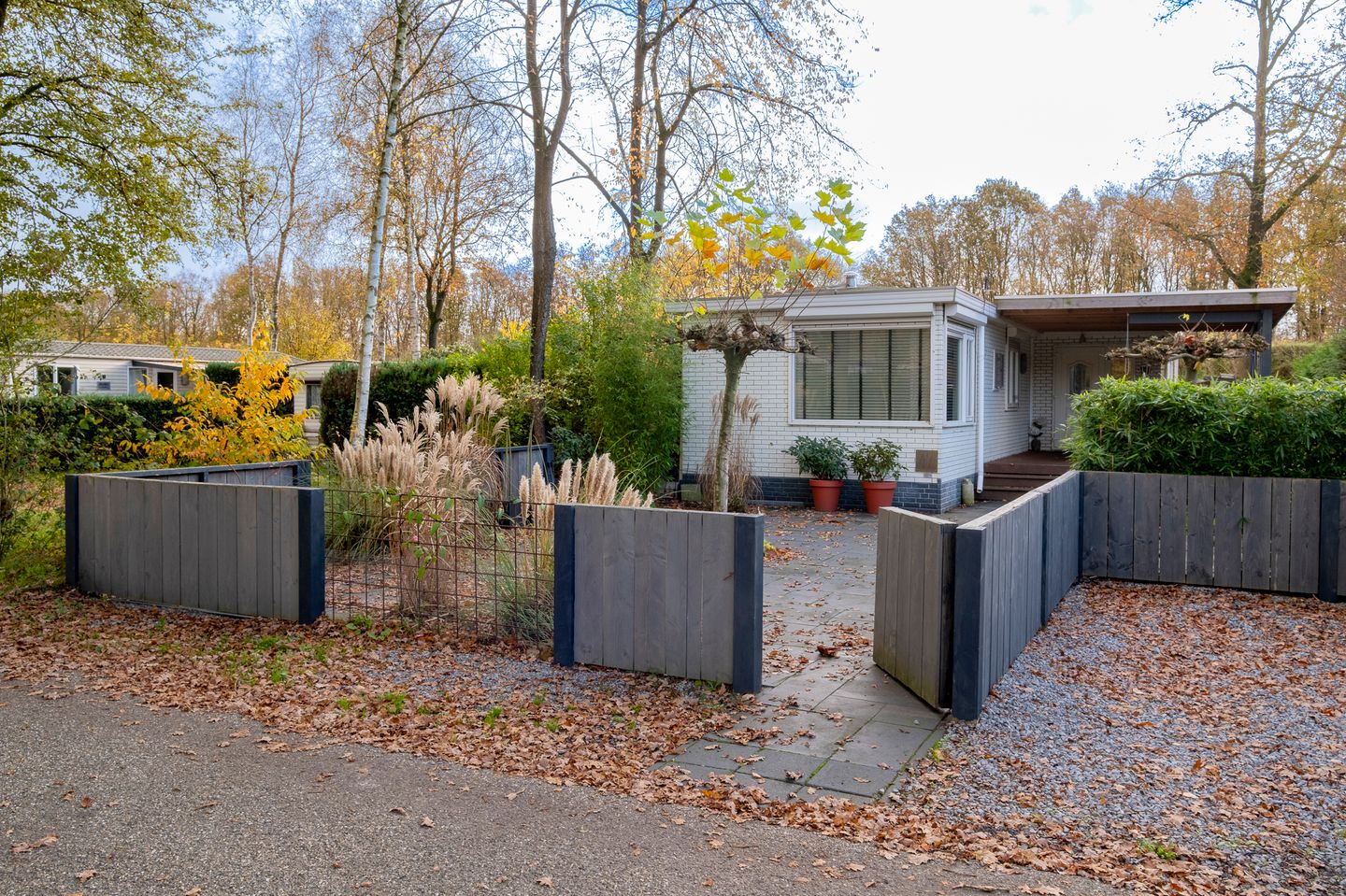 De tuin is afgesloten met een groene haag en stijlvol hekwerk en is gelegen op het zuid-westen. De ruime overdekte veranda (circa 20 m²) biedt voldoende ruimte om te genieten van de bosrijke omgeving. Achter het chalet is een berging (circa 13 m²) geplaatst die momenteel in gebruik is als klusruimte. Een tweede houten berging biedt de mogelijkheid om fietsen en tuinspullen op te slaan.