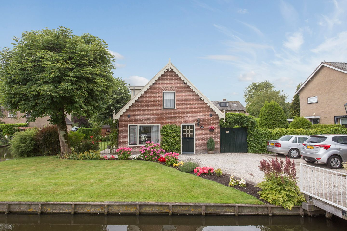 De woning is bereikbaar via een eigen brug over het water en komt uit op een ruime oprit met grindpad – plek genoeg voor meerdere auto’s. De voortuin is groen en verzorgd, met gras en vaste beplanting.