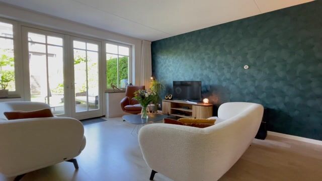 De zithoek in de woonkamer is gelegen aan de tuinzijde en tevens in het midden van het huis. Door de openslaande deuren met veel glasoppervlakte geniet u hier van veel daglicht en een directe verbinding met de achtertuin op het westen. Aan de linkerzijde van de zithoek bevindt zich de moderne open keuken die is voorzien donkergrijs gemêleerde kasten en inbouwapparatuur zoals koel-/vriescombinatie, oven, inductiekookplaat met geïntegreerde afzuiging, vaatwasser en heetwater kraan. Ook vanuit de keuken geven openslaande deuren toegang tot de achtertuin, wat zorgt voor een extra ruimtelijk gevoel en veel natuurlijk licht. Aan de voorzijde van de woning bevindt zich de gezellige eethoek, met genoeg ruimte voor een royale eettafel met 6 tot 8 stoelen.