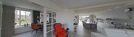 De tweede woning is net zo karaktervol, charmant en vol mogelijkheden. Ook hier word je verwelkomd door een ruime hal en een woonkamer met grote raampartijen, een sfeervolle gashaard en een warm houten laminaatvloer. De serre aan de achterzijde is een ware eyecatcher: licht, uitnodigend en met schuifpui naar de tuin. Een heerlijke plek om vier seizoenen lang te genieten van het uitzicht. De open keuken is praktisch en gezellig, met een inductiekookplaat, koelkast, vriezer, vaatwasser en combi-magnetronoven. Achterin de woning bevindt zich een ruime slaapkamer (nu in gebruik als inloopkast) met wastafel, naast een grote voorraadkast en het tweede toilet.