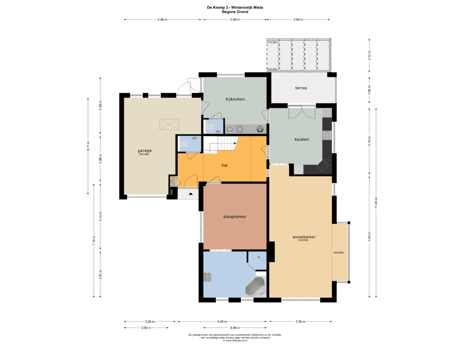 BEGANE GROND: Entree/hal, meterkast, toilet met fonteintje, woonkamer met zit- en eetgedeelte voorzien van een gashaard met schouw, keuken met inbouwapparatuur (o.a. koelkast, vaatwasser, afzuigkap, combi-oven, inductie kookplaat) en toegang naar terras; zeer ruime slaapkamer voorzien van royale badkamer met wastafelmeubel, douche en ligbad; bijkeuken met wasmachine en drogeraansluiting en toilet met fonteintje, garage met vliering.
