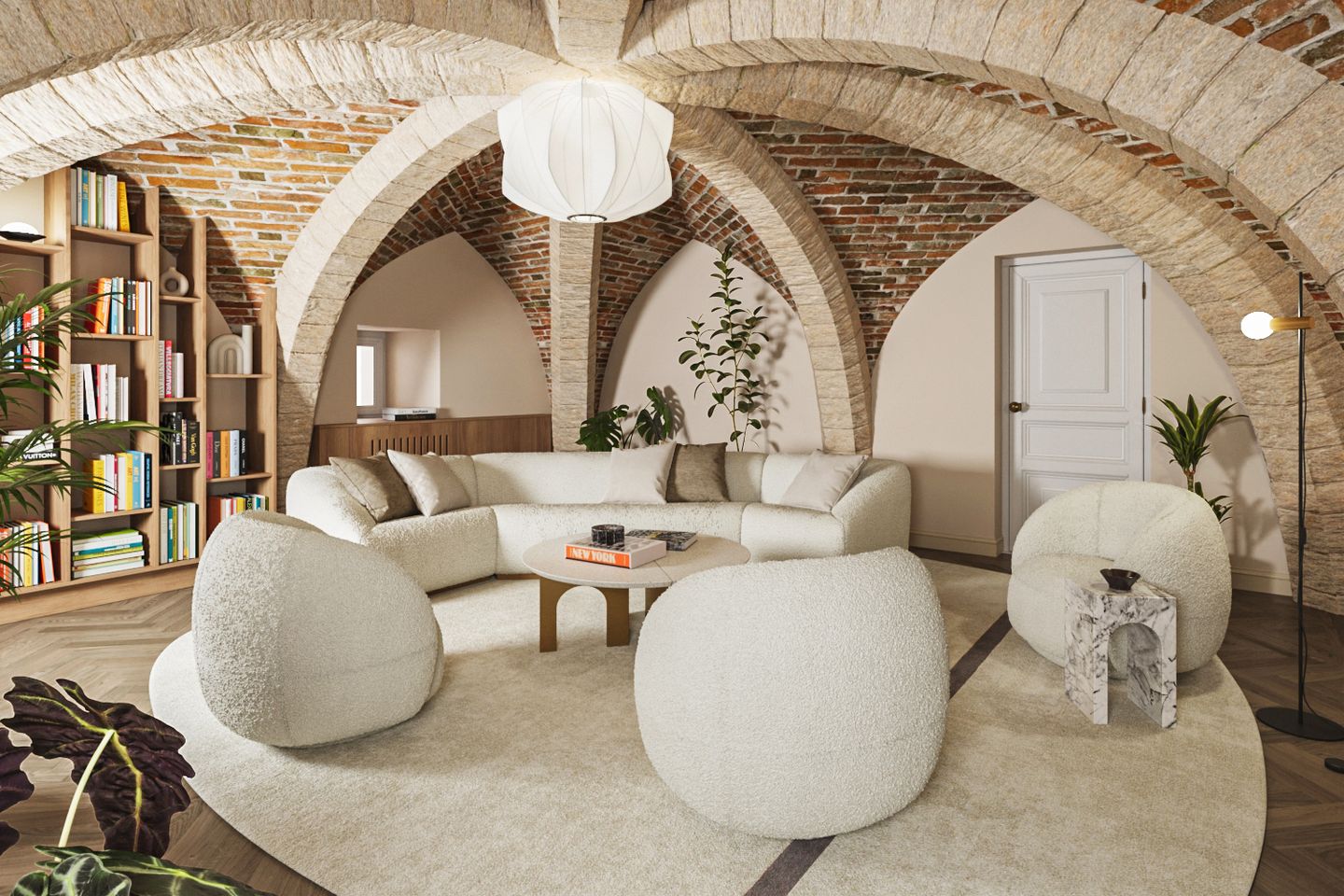 Het appartement heeft een eigen entree maar kan ook via de centrale hal worden benaderd. De royale woonkamer en keuken (66 m²) liggen aan de zuidzijde van het souterrain. Door het “openwerken” van de huidige kasteelmuur ontstaat een lichte ruimte met openslaande deuren naar een groot op het zuiden gelegen terras van Belgisch natuursteen dat zich gedeeltelijk onder een romantische boogstructuur bevindt. Hier vloeien binnen en buiten naadloos in elkaar over.