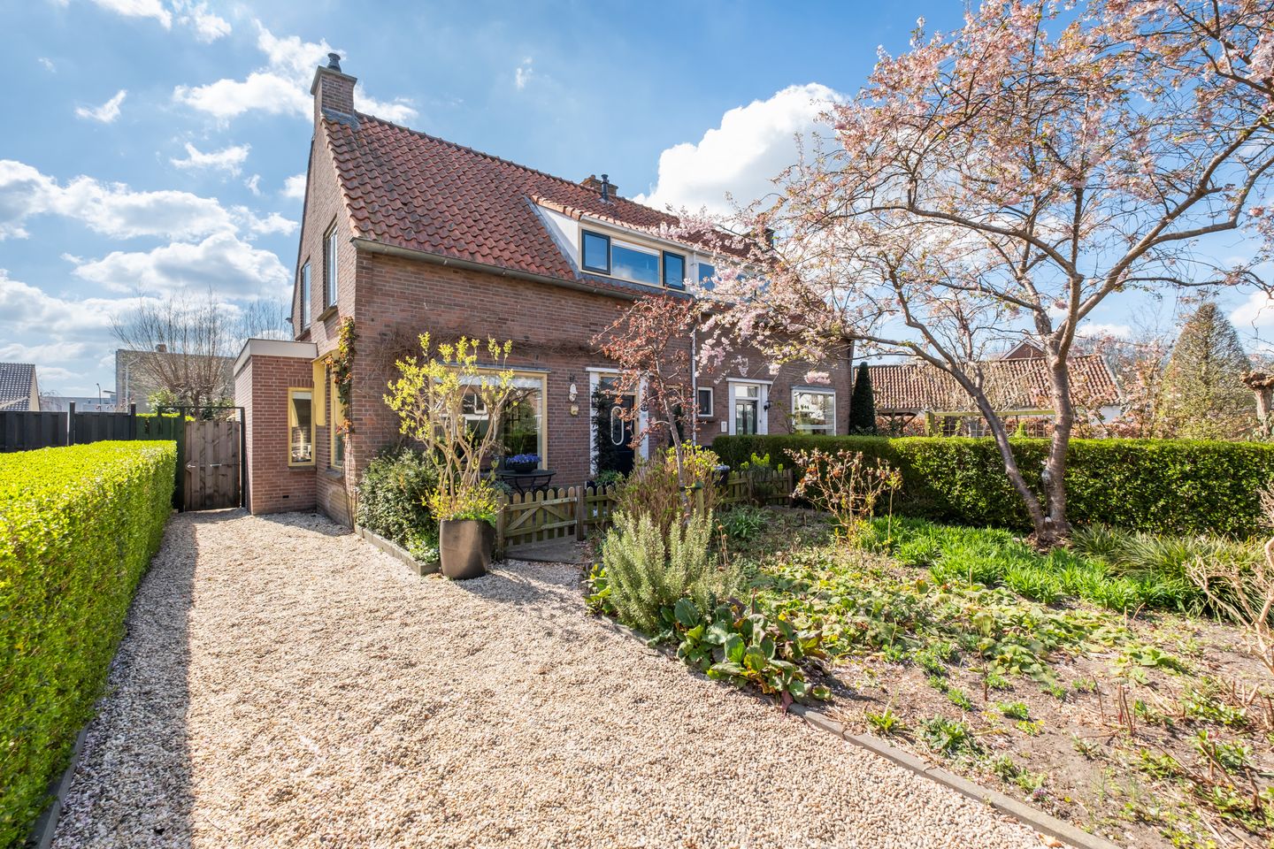 De verzorgde voortuin met een lengte van 12 meter biedt naast een aangenaam uitzicht vanuit de woonkamer ook een royale oprit aan de zijkant van het perceel. Hier kunnen meerdere voertuigen op eigen terrein worden geparkeerd. Ook praktisch is het pad langs de woning naar de achtertuin voorzien van een poortdeur.