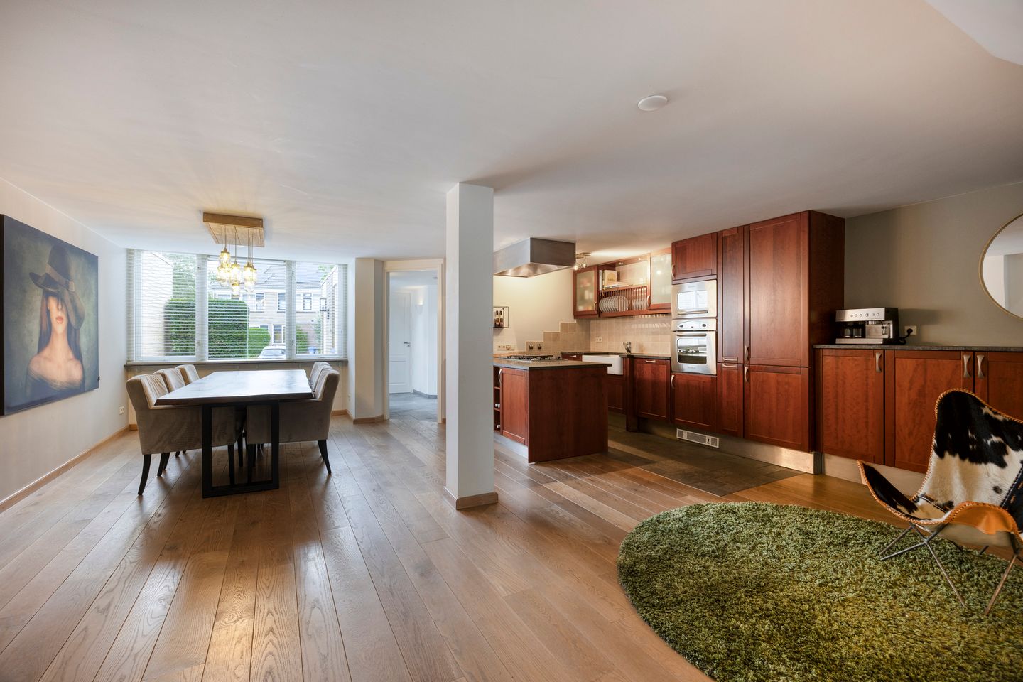 De keuken loopt vloeiend over in de sfeervolle, iets verlaagde woonkamer, die u via drie treden bereikt. Hier zorgen de gashaard en schuifpui naar de tuin voor warmte, licht en een fijne sfeer. De ruimte biedt volop plek voor een royale zithoek, met zicht op de achtertuin en serre.