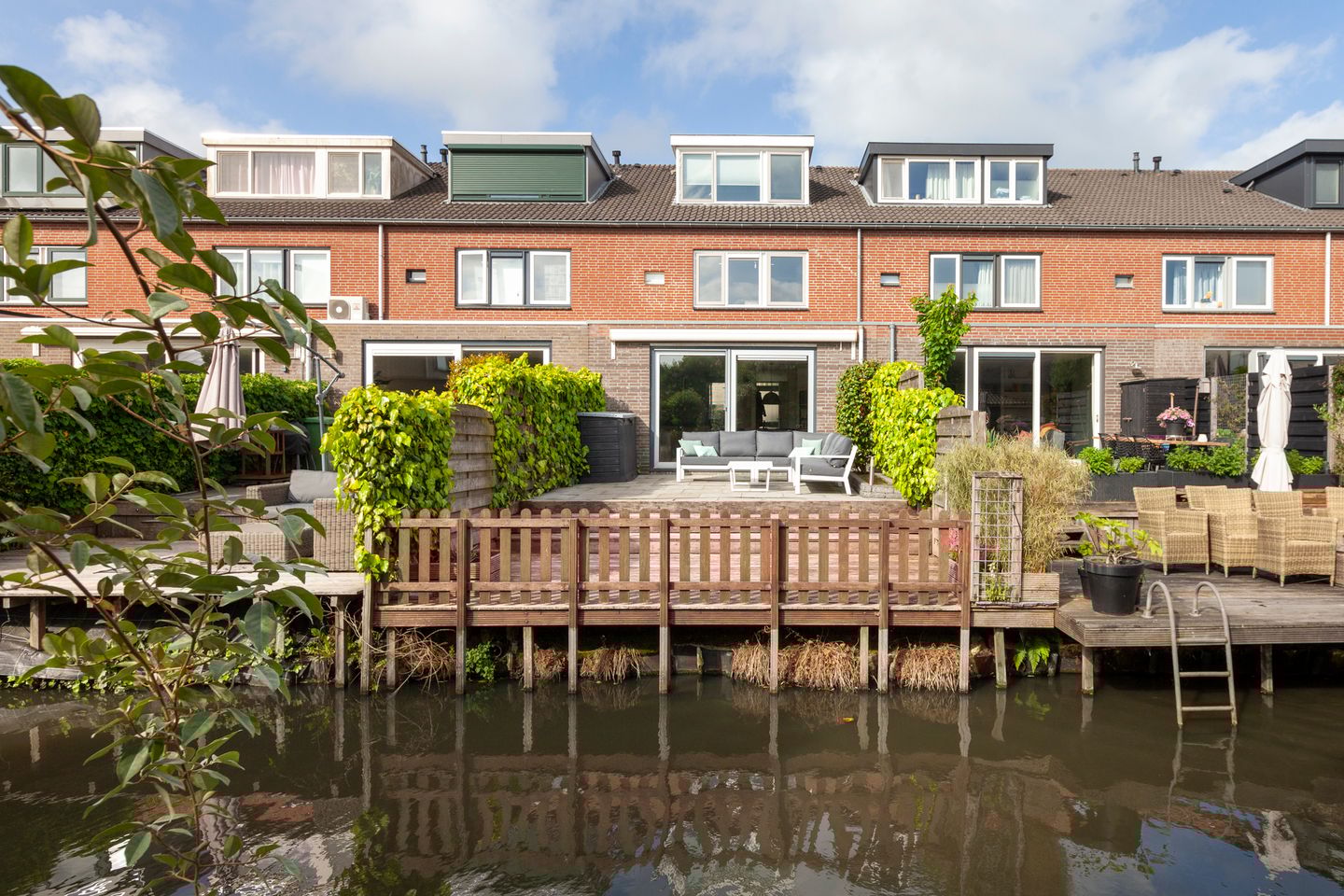 De diepe achtertuin grenst direct aan het water en biedt een sfeervol terras waar je optimaal van de zon kunt genieten.